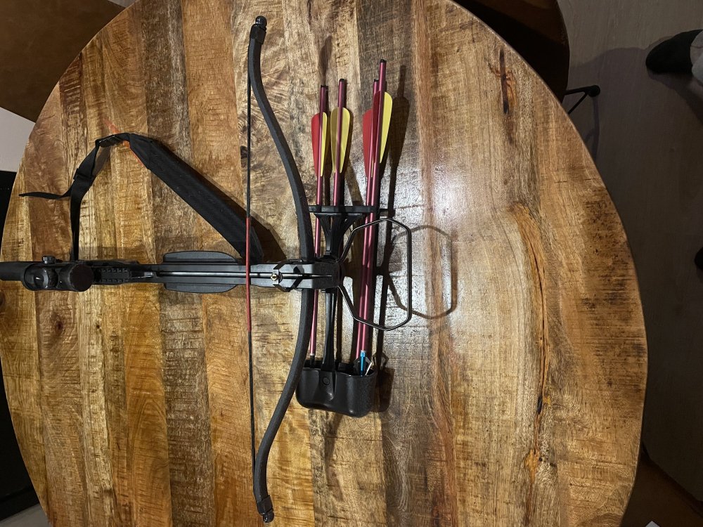 De kruisboog is nooit gebruikt en verkeert in nieuwstaat.