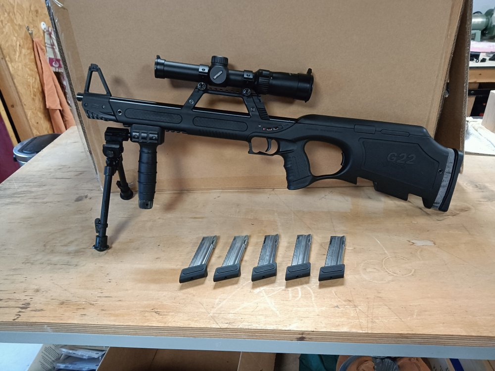 Een prima Walther G22 met kaliber .22LR, met 5 magazijnen.