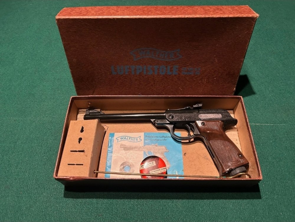 Een vroege (1958) Walther LP53 luchtpistool, serienummer 20536, dat in goede staat verkeert en wordt geleverd in de originele doos met accessoires. Het pistool is vergunningsvrij (minder dan 10 joule) en heeft een minimumleeftijd van 18 jaar bij aankoop.