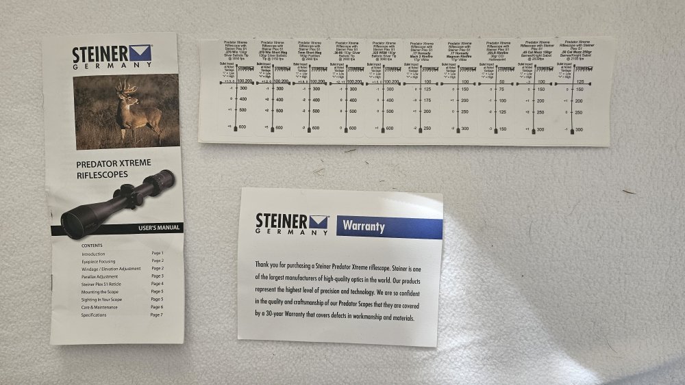 Gebruiksaanwijzingen van de Daystate buks en de Steiner kijker zijn inbegrepen.