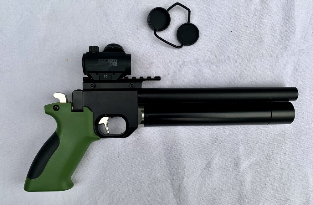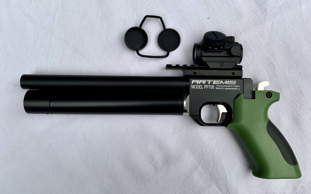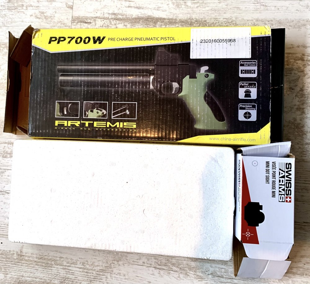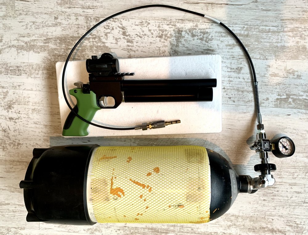 Te koop een complete set met nagenoeg nieuw wapen Artemis PP700W, een gloednieuwe red dot, nieuwe adapter van dovetail rail naar Piccatiny en vulset, bestaande uit een 10 liter luchtfles die nog in september 2024 is gereviseerd en goedgekeurd, een nieuwe vulslang plus drukmeter, nieuwe vulnippel plus adapter.