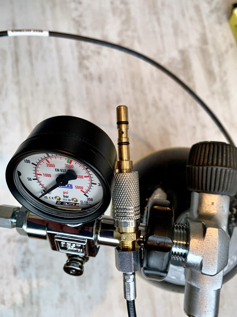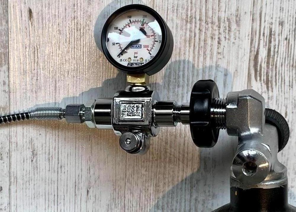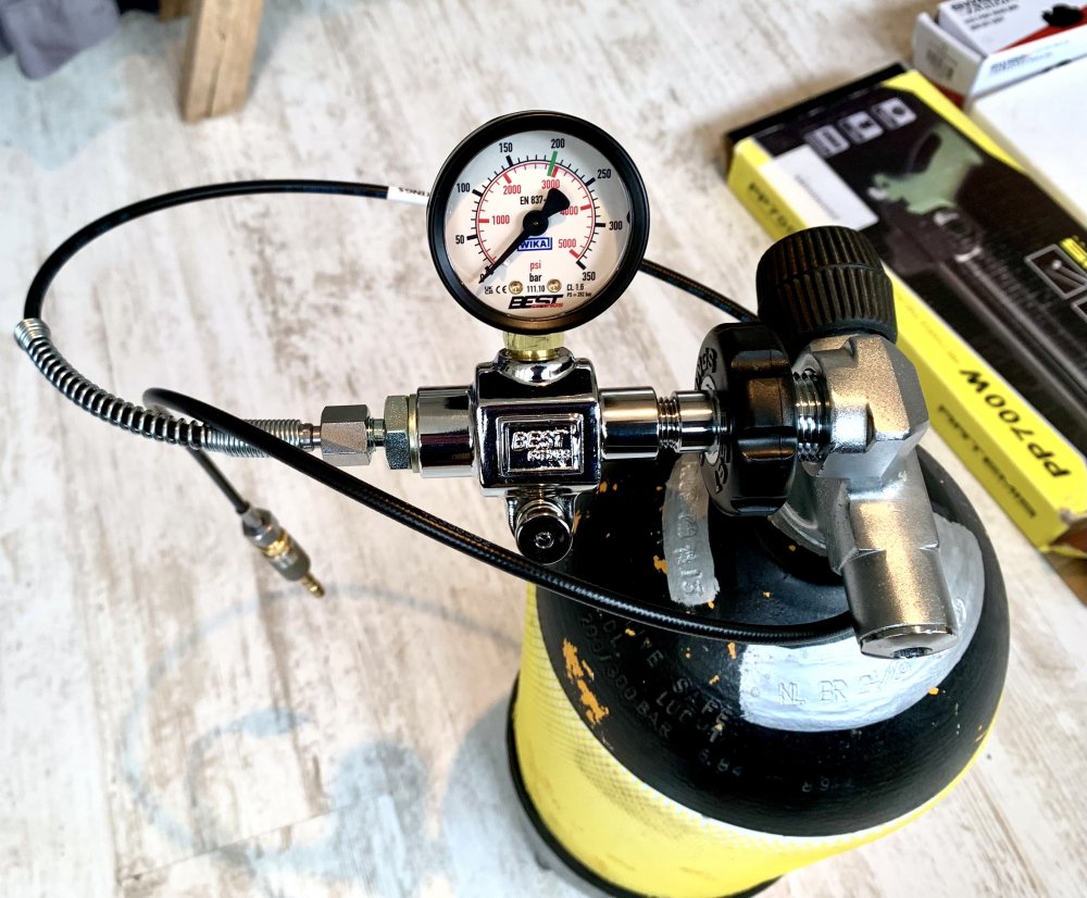 De DIN vulset van Best Fittings met manometer, ontluchtingskraan door midel van een drukknop en een microbore slang (1000mm) met 1/8 BSP binnendraad (female). Deze vulset is geschikt voor zowel 200 bar als 300 bar persluchtkranen. Er zit een adapter bij voor de vulnippel van de Artemis. Nieuw aangeschaft in september 2025.