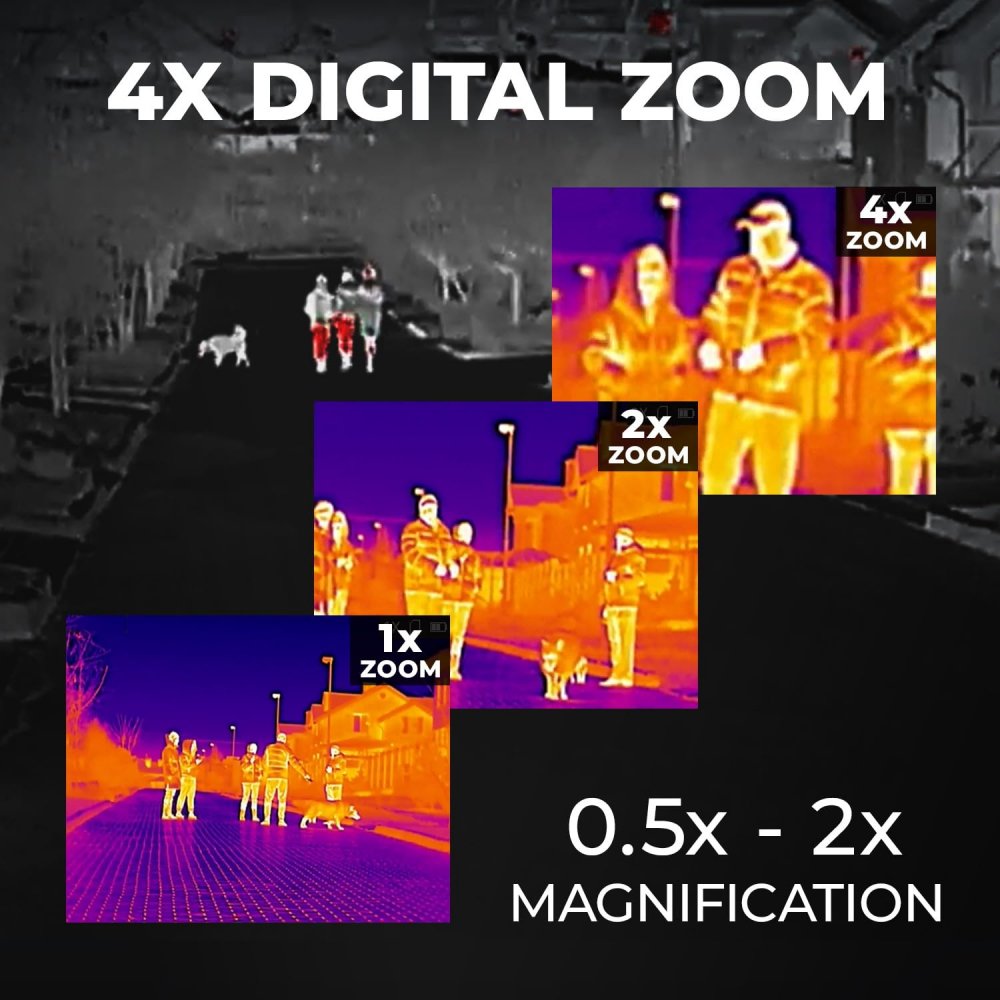 U kunt de omgeving naar eigen voorkeur laten weergeven met behulp van vier kleurenpaletten: White hot, Black hot, Red hot en Fusion. De warmtebeeldcamera beschikt tevens over een zogenaamde Hot Track-functie waarmee dieren/mensen met cursor direct "aangewezen" worden. Ook kunt u de afstand tot mensen, objecten of dieren bij benadering meten via de functie "Distance measurement". U kunt de helderheid en contrast zowel automatisch als handmatig regelen (vijf niveaus)