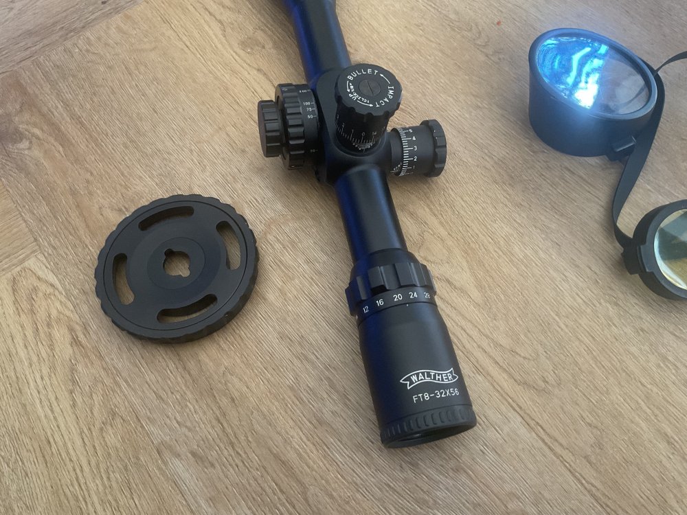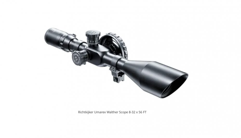 In zeer goede staat. Umarex Walther Scope 8-32 x 56 FT - Deze richtkijker heeft een groot objectief waardoor hij veel licht inzamel vermogen heeft. De richtkijker is voorzien van een mill dot draagkruis en heeft een sidewheel parallaxe adjustment.