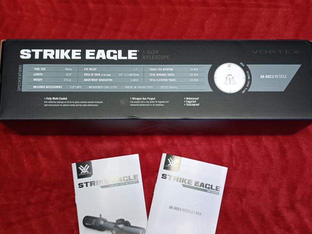 Nieuwe Vortex Strike Eagle 1-8x24 SFP nieuw in de doos nog nooit gebruikt.Kan opgehaald worden of verstuurd per bpost verzekerd.