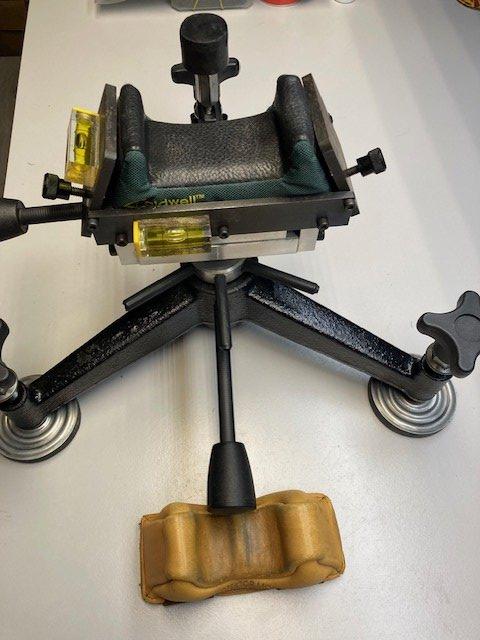Voorste steun (voor de loop): Dit is het deel waar de voorzijde van het geweer op rust. Het wordt vaak aangepast om de loop in de juiste positie te houden. Bij mijn steun zitten twee kussentjes voor een ronde standaard kolf en een plat kussen voor een benchrest kolf.