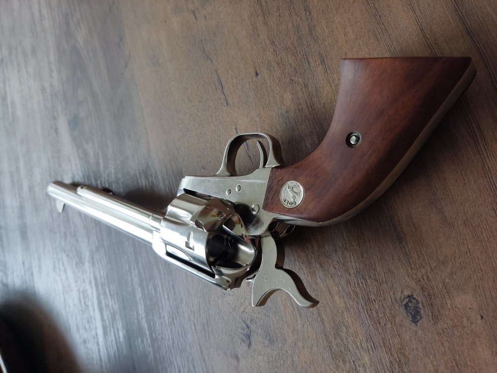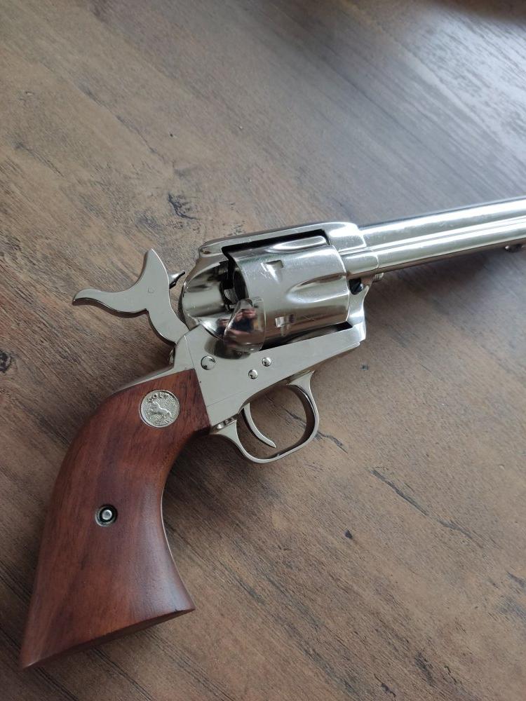 Fabricage: Colt. Weinig mee geschoten. Enkel zwart kruit. In orginele staat. Caliber: 45C. Aangeboden met lederen holster en riem.