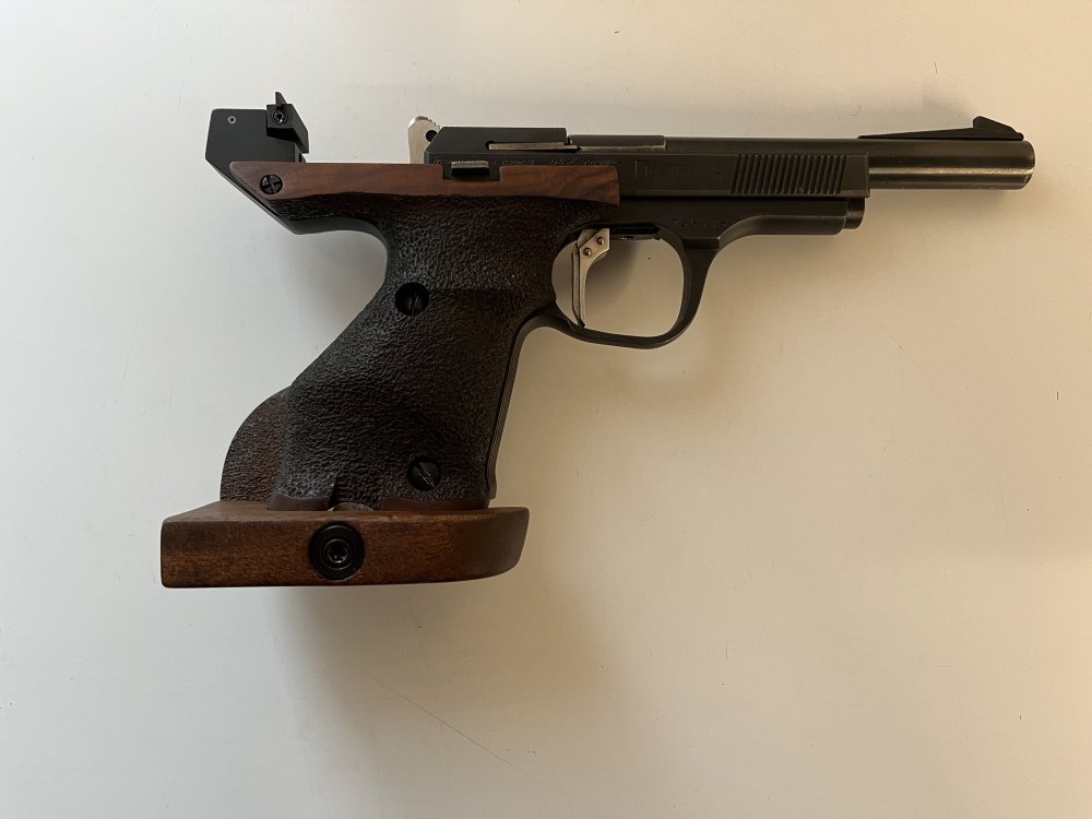 Hierbij bied ik dit fraaie pistool aan. Dit pistool zit in de originele koffer, waarbij ik het binnenwerk heb vernieuwd. Er zit een origineel loopgewicht van 250 gram en een later op maat gemaakt loopgewicht van 150 gram. Verder 2 originele magazijnen.