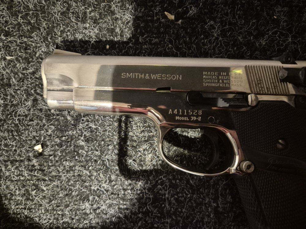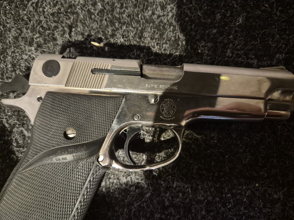 Te koop aangeboden: Smith & Wesson 39-2 nikkel in cal. 9mm. Pistool is in goede staat en gaat weg wegens vrijmaken van plek op verlof.