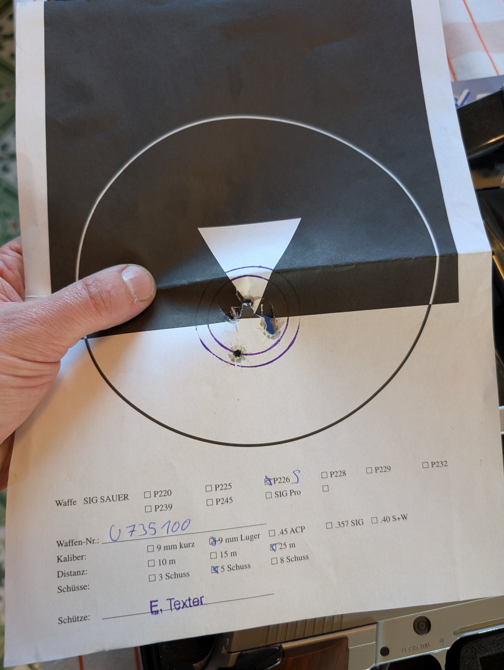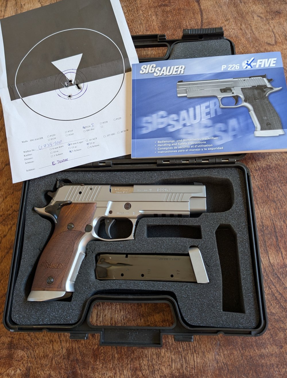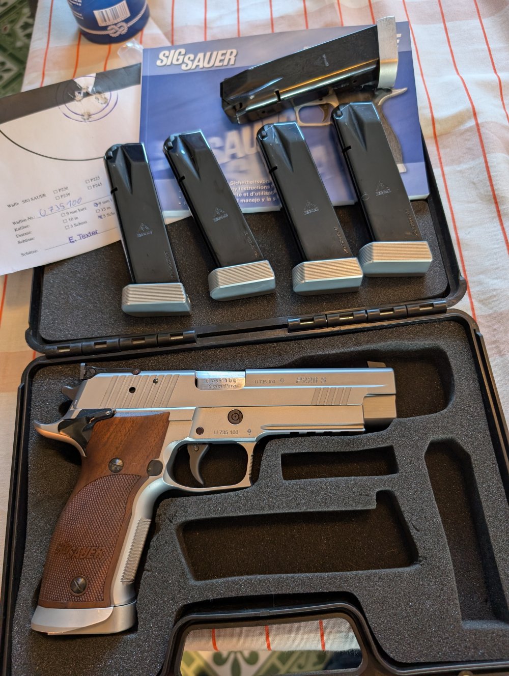 Het gaat om de eerste generatie van de P226 X-Five die in Duitsland gemaakt werd (helaas niet meer), een zeer geliefd pistool bij schutters, waaronder ook dynamische pistoolschutters. Ik heb het pistool niet veel gebruikt en het lijkt het me sterk dat mijn voorganger er wel veel mee geschoten heeft gezien de staat.