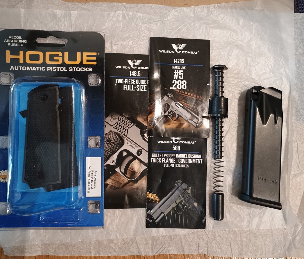 In nieuwstaat, origineel en WILSON Tuned, cal..45 AUTO; voorzien van HOGUE greep en drie laders in originele box.